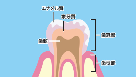 むし歯(虫歯)とは、ミュータンス菌などのむし歯(虫歯)原因菌が出す酸によって、歯のカルシウムが溶かされ、歯がもろくなり、ついには穴が開いてしまう病気のことです。むし歯(虫歯)は歯周病と同じように、重症になるまでは自覚症状が少ないため自分では気づきにくいことが特徴です。しかし、歯に穴が開く前に定期健診などで発見できれば、元の状態に戻すことができます。