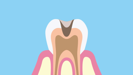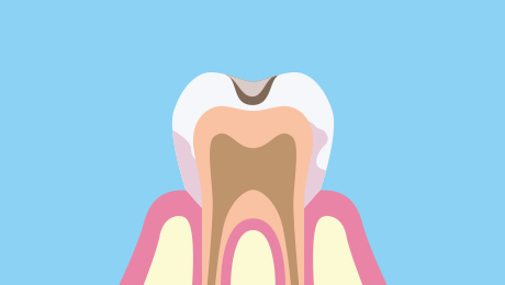 むし歯がエナメル質に進行し、歯の表面が白くにごったり黒く見えている状態。痛みは感じません。