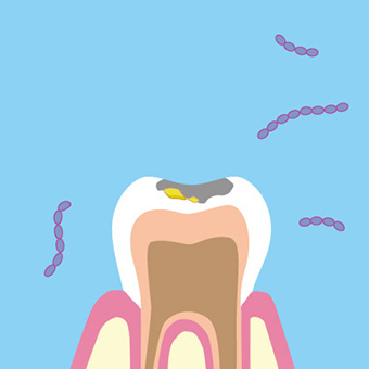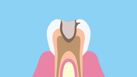 むし歯が象牙質にまで進行し、歯の表面が黒く見えている状態。噛む時に痛みを感じることもあります。