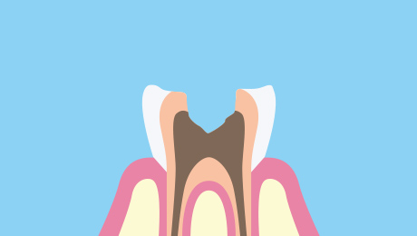 むし歯の進行により、歯冠部(しかんぶ)が大きく壊れて、歯根部だけが残った状態。この段階では、痛みは感じなくなってきます。