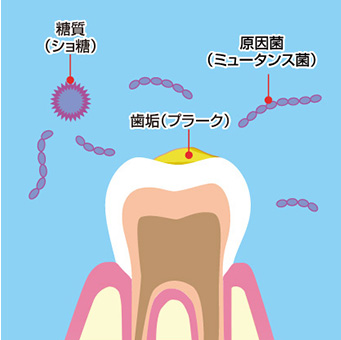 お口の中の原因菌(ミュータンス菌)が糖質(ショ糖)を取り込み、歯垢(プラーク)を形成します。