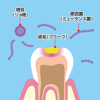 むし歯(虫歯)は、様々な要因が重なって発生します。その要因のうち大きく関わっているのが、糖質(ショ糖)、原因菌(ミュータンス菌)、歯質(エナメル質・象牙質)です。