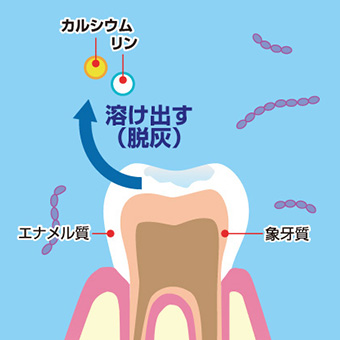 酸によって歯質(エナメル質・象牙質)からカルシウムやリンが溶け出します(脱灰)。