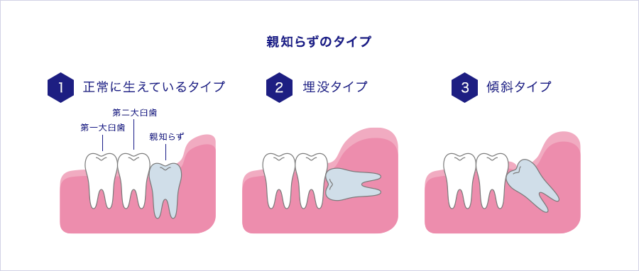 上顎、下顎の一番奥、しかも、ほかの歯が生え揃った後に生えてくるので、場所が狭く、歯茎に埋もれたままだったり(埋没タイプ)、斜めに生えてきたり(傾斜タイプ)することがあります。